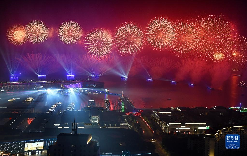 這是2018年6月9日晚在青島舉行的《有朋自遠(yuǎn)方來(lái)》燈光焰火藝術(shù)表演。2018年6月9日至10日,上海合作組織成員國(guó)元首理事會(huì)第十八次會(huì)議在青島召開。新華社記者 李紫恒 攝