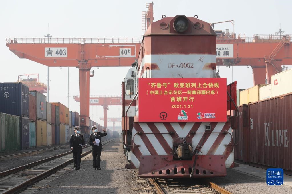 膠州海關(guān)關(guān)員對(duì)“齊魯號(hào)”歐亞班列上合快線(中國(guó)上合示范區(qū)——阿塞拜疆巴庫(kù))線路首班列車進(jìn)行檢查(2021年1月31日攝)。新華社發(fā)(解豪攝)