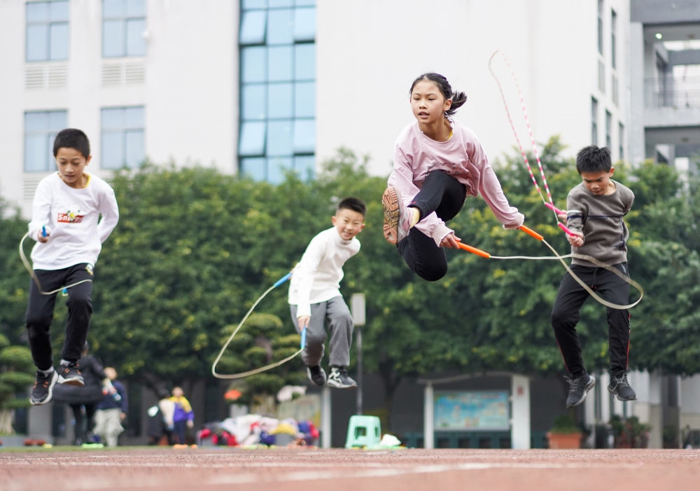 重慶市九龍坡區(qū)西彭鎮(zhèn)第一小學(xué)校學(xué)生在體育課上進(jìn)行花樣跳繩訓(xùn)練(2020年12月9日攝)。