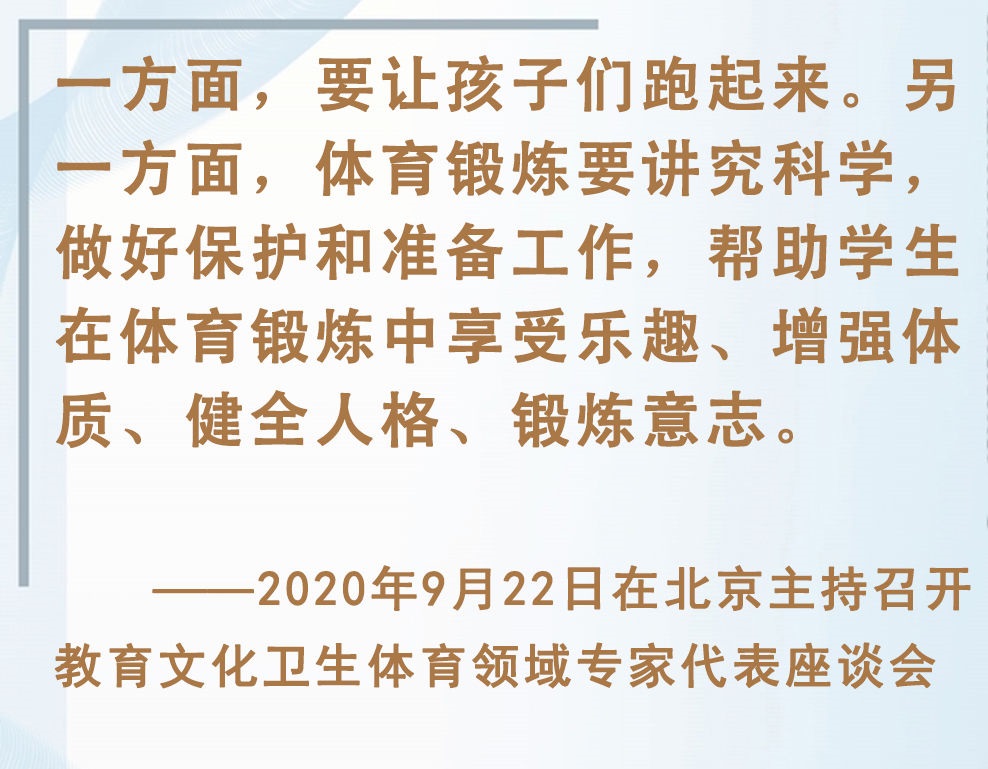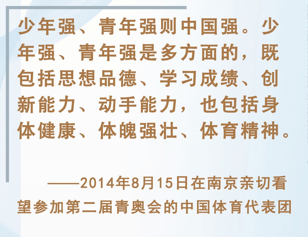 青少年是祖國(guó)的未來(lái)、民族的希望。強(qiáng)健的體魄是青少年成長(zhǎng)成才的重要前提。對(duì)加強(qiáng)體育教育,增強(qiáng)青少年體質(zhì),習(xí)近平總書記念茲在茲。
