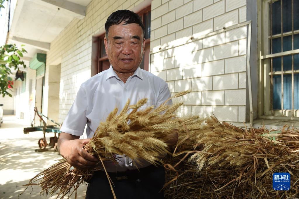 2022年6月28日,徐淙祥在安徽太和縣淙祥現代農業(yè)種植專業(yè)合作社察看小麥樣品。新華社記者 周牧 攝
