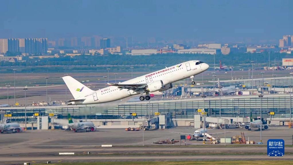 2022年5月14日6時52分,編號為B-001J的C919大飛機從上海浦東機場第4跑道起飛,于9時54分安全降落,標志著中國商飛公司即將交付首家用戶的首架C919大飛機首次飛行試驗圓滿完成。新華社發(fā)