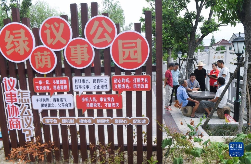 在浙江省湖州市長(zhǎng)興縣呂山鄉(xiāng)龍溪村的議事公園內(nèi),田園議事會(huì)成員開展討論協(xié)商(2022年7月21日攝)。新華社記者 徐昱 攝
