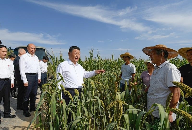 △2021年9月13日,習(xí)近平總書(shū)記在陜西米脂縣高西溝村臨時(shí)下車,察看糧食作物長(zhǎng)勢(shì),同正在田間勞作的老鄉(xiāng)拉家常。