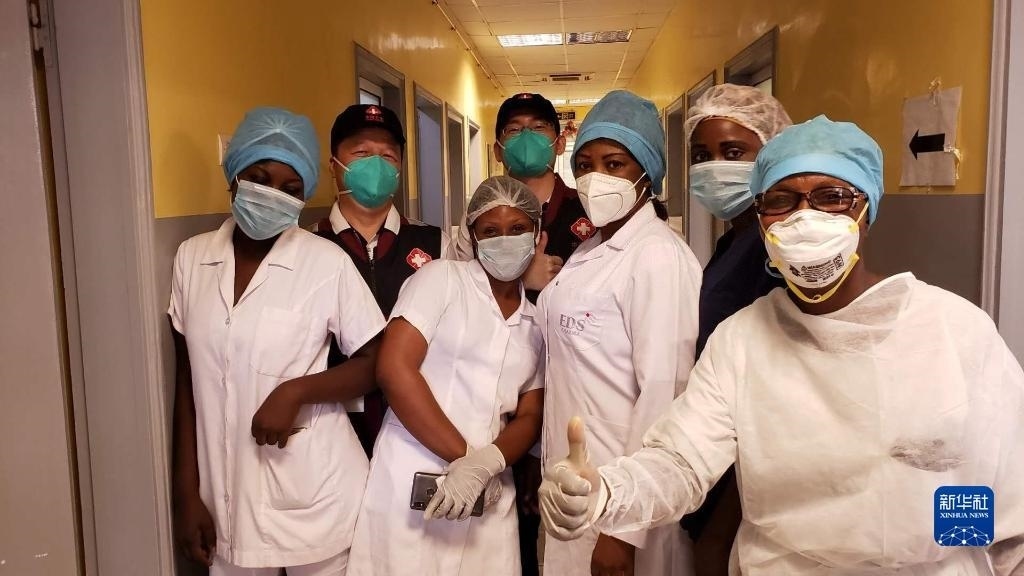 2020年5月26日,中國抗疫醫(yī)療專家組在剛果(布)首都布拉柴維爾指導(dǎo)新冠肺炎病房建設(shè)時,與當(dāng)?shù)匾痪€醫(yī)務(wù)人員合影。新華社發(fā)