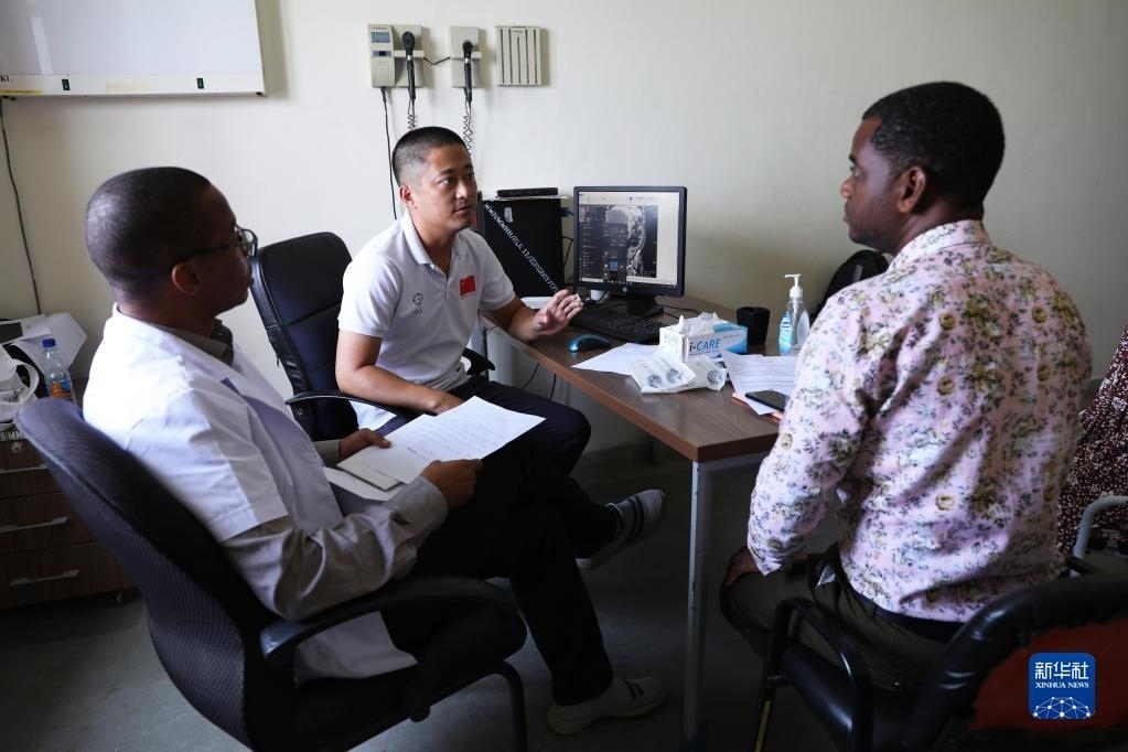 2023年2月22日,在坦桑尼亞桑給巴爾島納茲莫加醫(yī)院,中國援桑給巴爾醫(yī)療隊成員郭偉(左二)給病人看病。新華社記者 董江輝 攝