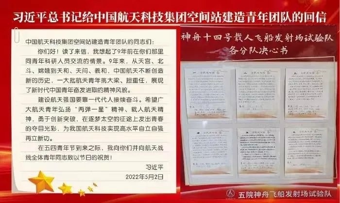 2022年5月2日,習(xí)近平總書記給中國航天科技集團空間站建造青年團隊回信,高度肯定航天青年,殷切期待青春奮斗。他強調(diào):“希望廣大航天青年弘揚‘兩彈一星’精神、載人航天精神,勇于創(chuàng)新突破,在逐夢太空的征途上發(fā)出青春的奪目光彩,為我國航天科技實現(xiàn)高水平自立自強再立新功?!币荒陙?,五院人持續(xù)學(xué)習(xí)重溫、堅決貫徹落實習(xí)近平總書記重要回信精神和關(guān)于航天強國建設(shè)的重要指示批示精神,始終做到牢記囑托、感恩奮進(jìn),交出非凡“答卷”。