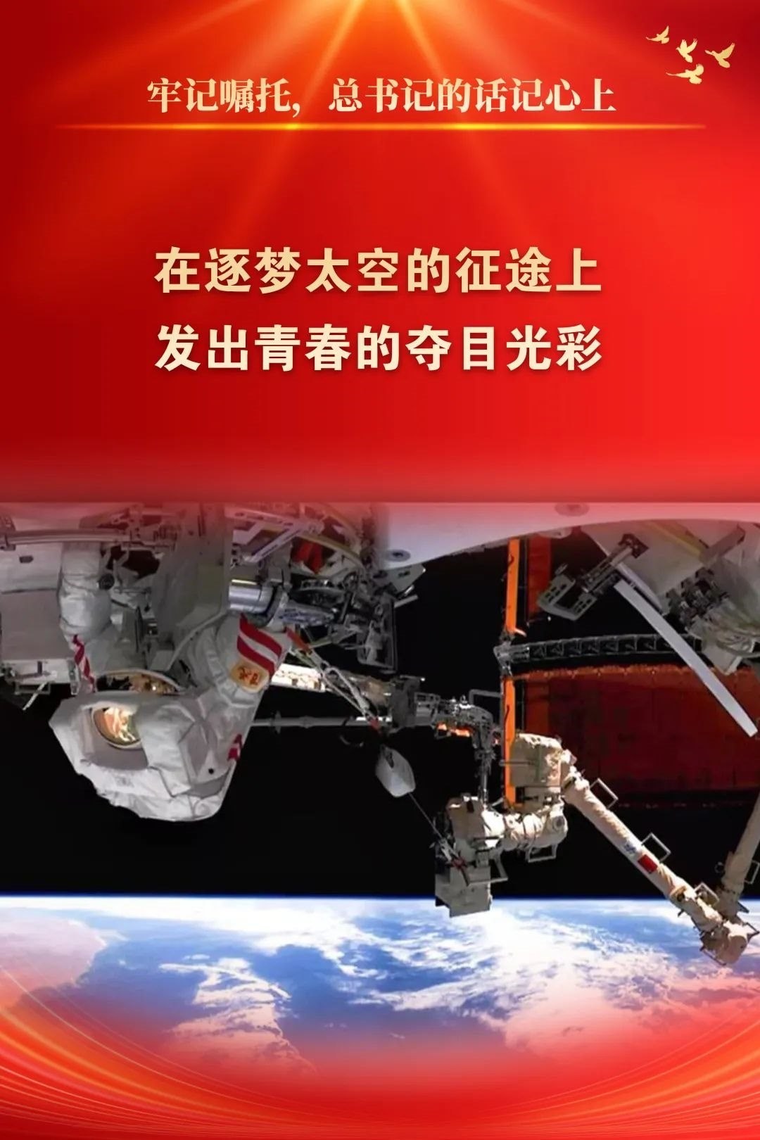 2013年5月4日,習(xí)近平總書記到航天科技集團五院參加“實現(xiàn)中國夢、青春勇?lián)?dāng)”主題團日活動時指出:“我們同青年朋友們到航天城來,就是要實地感受載人航天精神,激勵包括廣大青年在內(nèi)的全國各族人民為實現(xiàn)中華民族偉大復(fù)興的中國夢而奮斗?!笔陙恚逶喝耸冀K堅定沿著黨指引的方向前進(jìn),圓滿完成了以載人航天、探月探火、北斗導(dǎo)航等為代表的一系列航天重大工程任務(wù)。