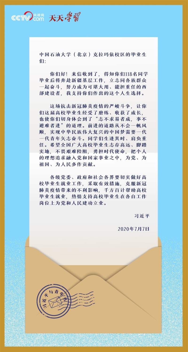 2020年畢業(yè)季,中國石油大學(xué)(北京)克拉瑪依校區(qū)118名即將到新疆基層就業(yè)的大學(xué)生,在離開母校之際,給習(xí)近平總書記寫信匯報了大學(xué)四年學(xué)習(xí)和思想上的收獲,表達(dá)了立志同各族群眾一起奮斗、建設(shè)美麗邊疆的決心。