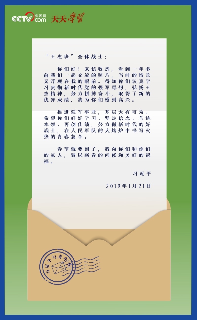 當(dāng)收到來自中南海的回信,“王杰班”的戰(zhàn)士們個(gè)個(gè)難掩激動(dòng)。習(xí)主席在信中殷殷勉勵(lì)大家“努力做新時(shí)代的好戰(zhàn)士,在人民軍隊(duì)的大熔爐中書寫火熱的青春篇章”。