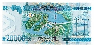 △在幾內(nèi)亞央行發(fā)行的該國(guó)最大面值兩萬(wàn)幾郎紙幣上,印著中國(guó)長(zhǎng)江三峽集團(tuán)有限公司總承建的凱樂(lè)塔水電站。