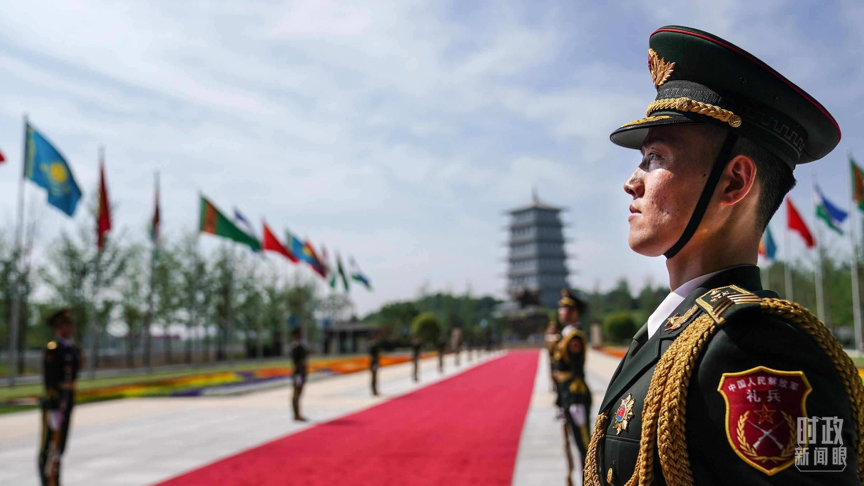 △ 迎賓紅毯兩側(cè),中國人民解放軍禮兵就位。(總臺國廣記者李晉拍攝)