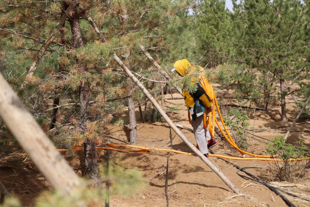 這是2023年5月31日,治沙工人在庫(kù)布其沙漠億利生態(tài)治理區(qū)內(nèi)搬運(yùn)水管,準(zhǔn)備為樹(shù)木澆水。新華社記者 王楷焱 攝
