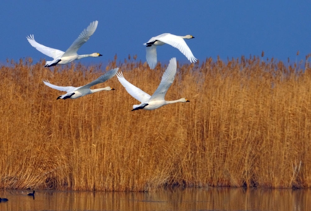 2020年11月15日,幾只天鵝飛翔在烏梁素海上空。
