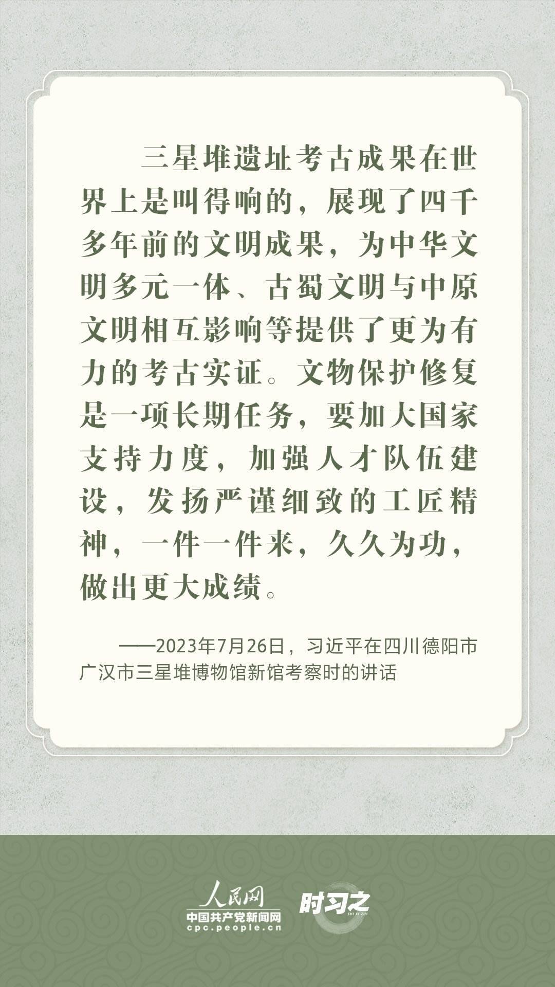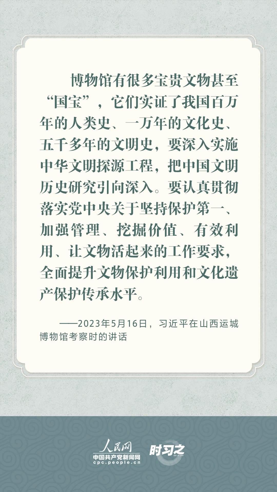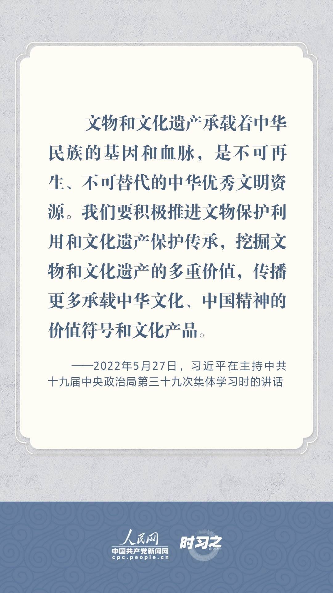 文物承載燦爛文明,傳承歷史文化,維系民族精神。習(xí)近平總書記站在中華民族和中華文明永續(xù)傳承的戰(zhàn)略高度,不斷強(qiáng)調(diào)保護(hù)傳承中華優(yōu)秀傳統(tǒng)文化,為增強(qiáng)文化自信、激發(fā)中華優(yōu)秀傳統(tǒng)文化的生機(jī)與活力注入了強(qiáng)大精神動力。