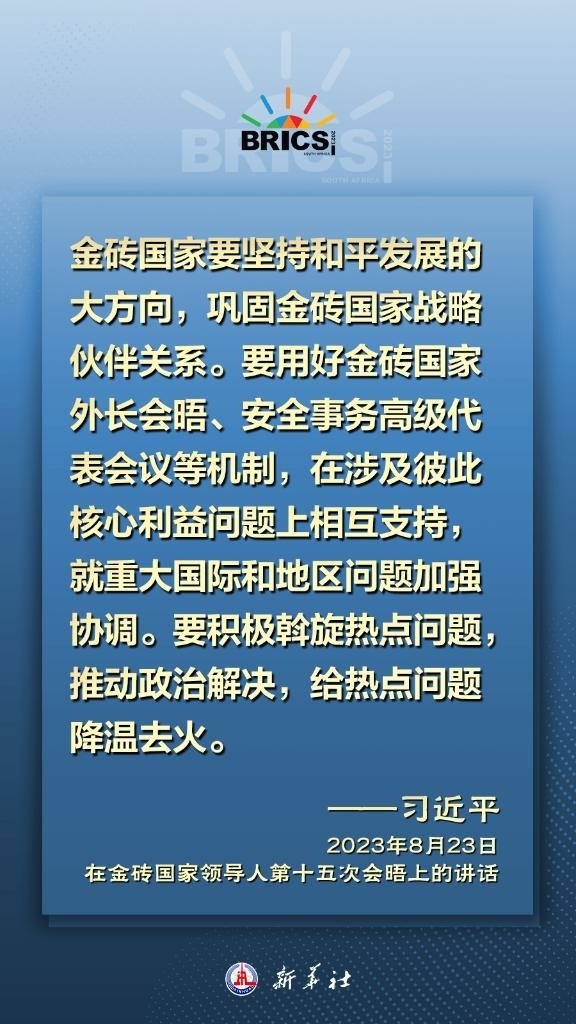 國(guó)家主席習(xí)近平23日在南非約翰內(nèi)斯堡舉行的金磚國(guó)家領(lǐng)導(dǎo)人第十五次會(huì)晤上發(fā)表講話指出,金磚合作正處于承前啟后、繼往開(kāi)來(lái)的關(guān)鍵階段。我們要把握大勢(shì),引領(lǐng)方向,堅(jiān)守聯(lián)合自強(qiáng)的初心,加強(qiáng)各領(lǐng)域合作,推進(jìn)高質(zhì)量伙伴關(guān)系,推動(dòng)全球治理變革朝著更加公正合理的方向發(fā)展,為世界注入更多確定性、穩(wěn)定性、正能量。