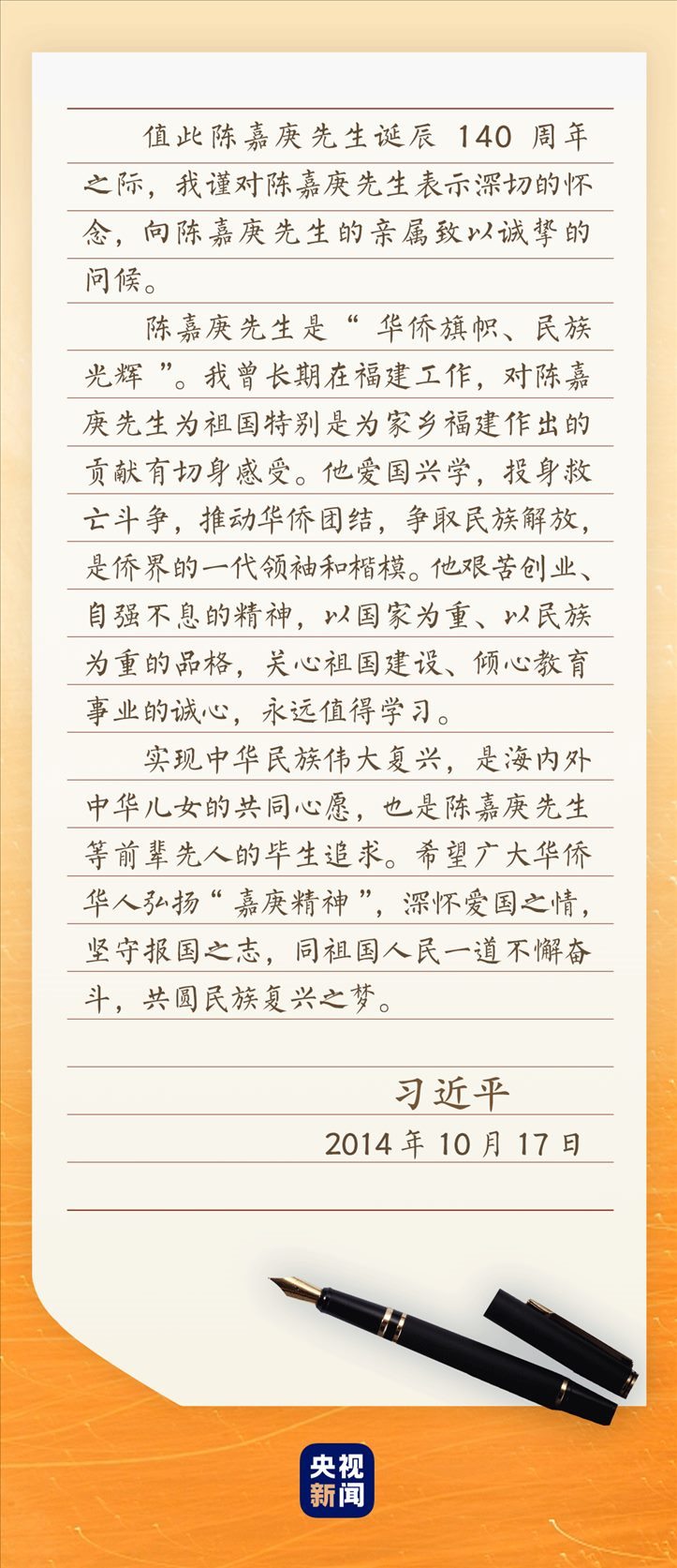 2014年10月21日,福建廈門。紀念陳嘉庚誕辰140周年座談會現(xiàn)場,雷鳴般的掌聲經久不息。習近平總書記的回信,讓大家激動不已——