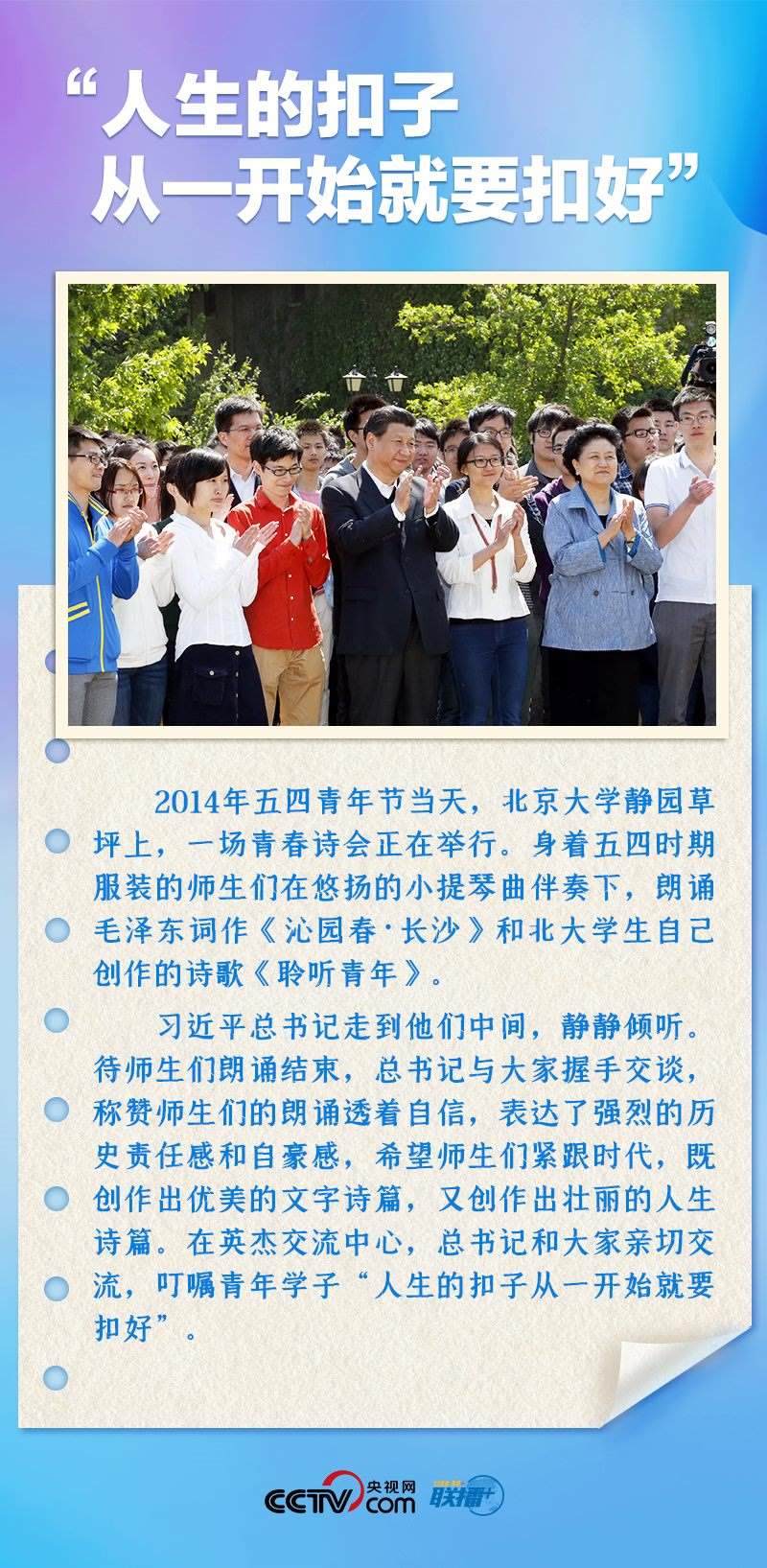 “青年猶如大地上茁壯成長的小樹,總有一天會長成參天大樹,撐起一片天。青年又如初升的朝陽,不斷積聚著能量,總有一刻會把光和熱灑滿大地。黨和國家的希望寄托在青年身上!”