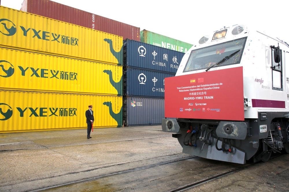 △2023年3月9日,以“中西建交紀(jì)念號”特別命名的“義新歐”中歐班列從馬德里鳴笛發(fā)車,與從義烏同時開出的列車雙向而行。