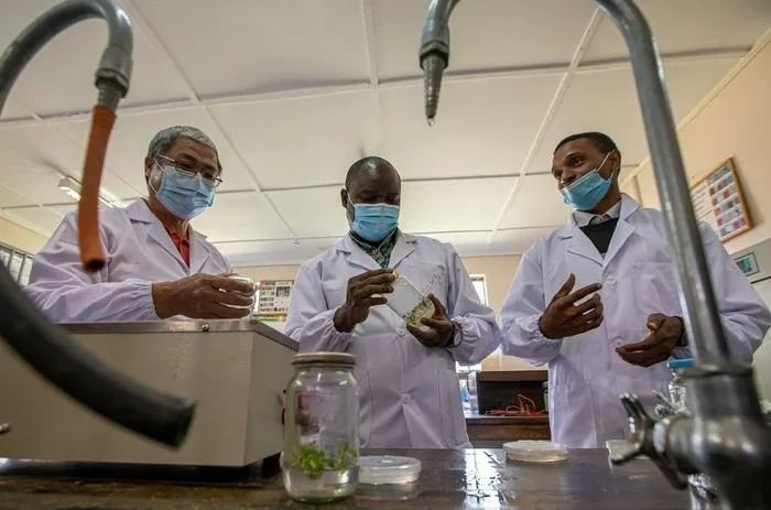 △2021年6月25日,肯尼亞,來自中國的農(nóng)學教授與肯尼亞農(nóng)業(yè)專家、肯方研究生在實驗室內(nèi)交流實驗成果。