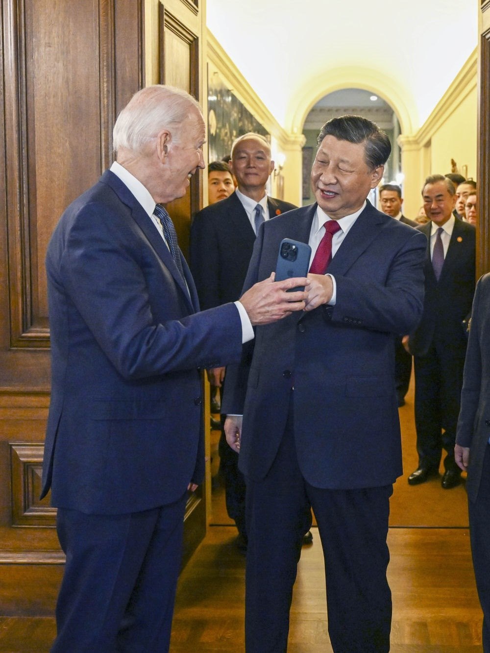 當(dāng)?shù)貢r(shí)間11月15日中午,美國(guó)舊金山郊外的斐洛里莊園,習(xí)近平主席結(jié)束同美國(guó)總統(tǒng)拜登的晤談,出席拜登總統(tǒng)舉行的宴會(huì)。拜登在手機(jī)上展示了1985年習(xí)近平在擔(dān)任正定縣委書(shū)記時(shí)訪問(wèn)舊金山的一張照片。這是展示的照片。新華社發(fā)
