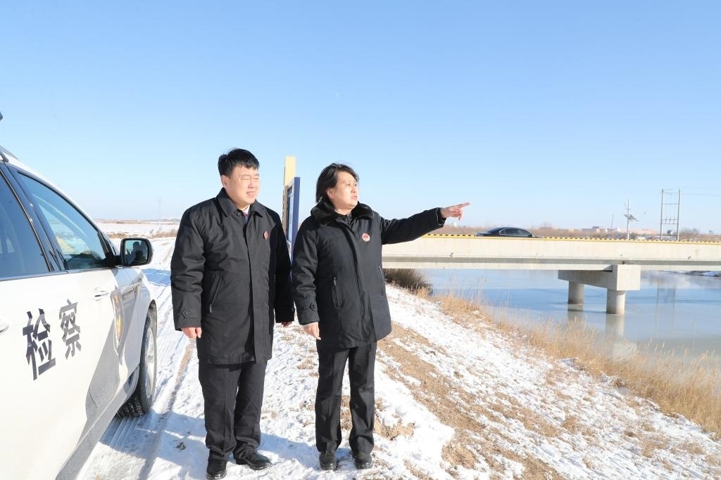 12月一場(chǎng)暴雪后,東營(yíng)區(qū)檢察院檢察官再次來到武家大溝堤壩檢查河道安全。(劉智峰 攝)