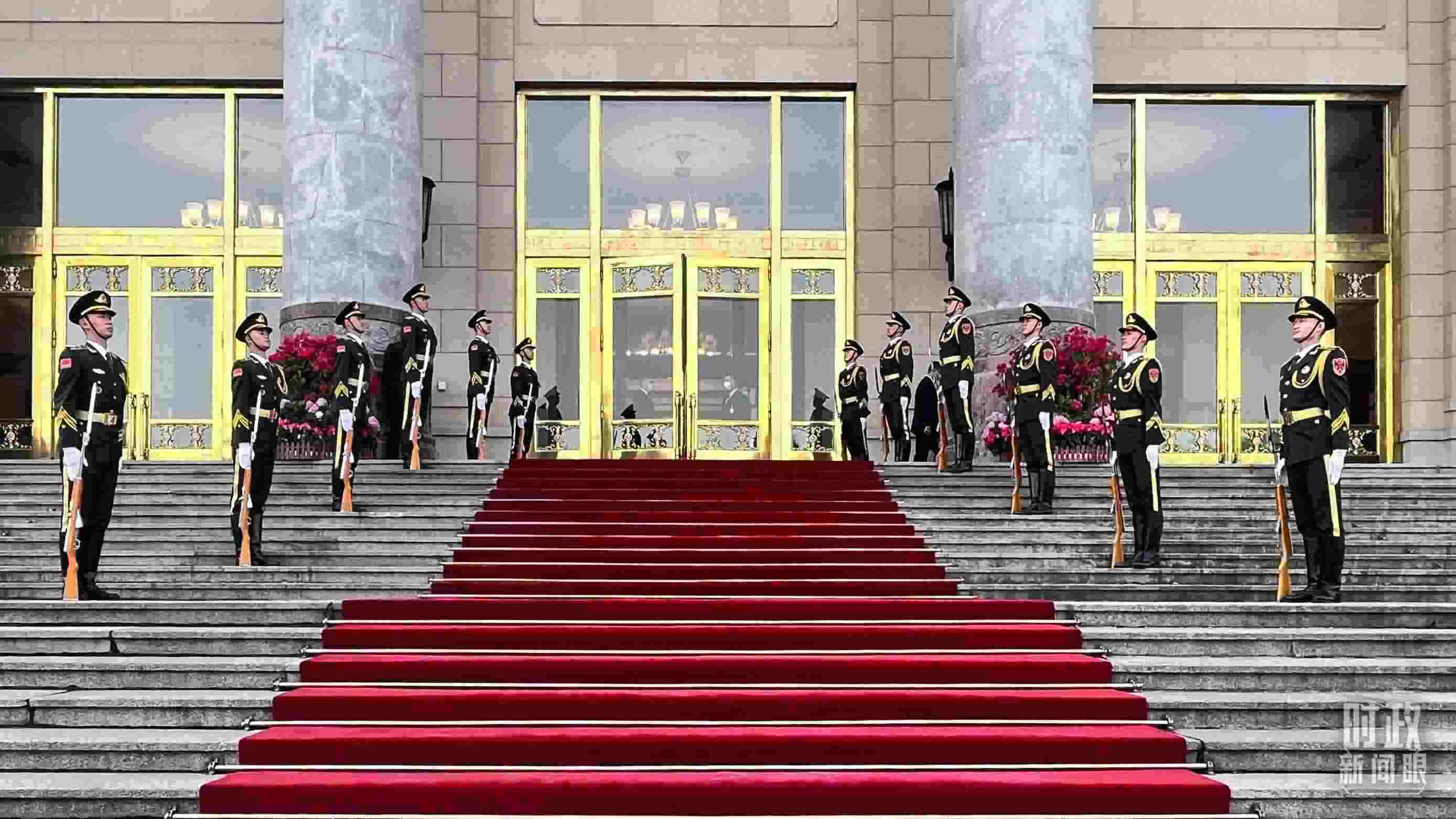 △ 2023年10月17日至20日,習(xí)近平主席在北京人民大會(huì)堂密集會(huì)見(jiàn)了26位外方領(lǐng)導(dǎo)人。圖為禮兵列隊(duì)迎接貴賓。(總臺(tái)央視記者張垚拍攝)