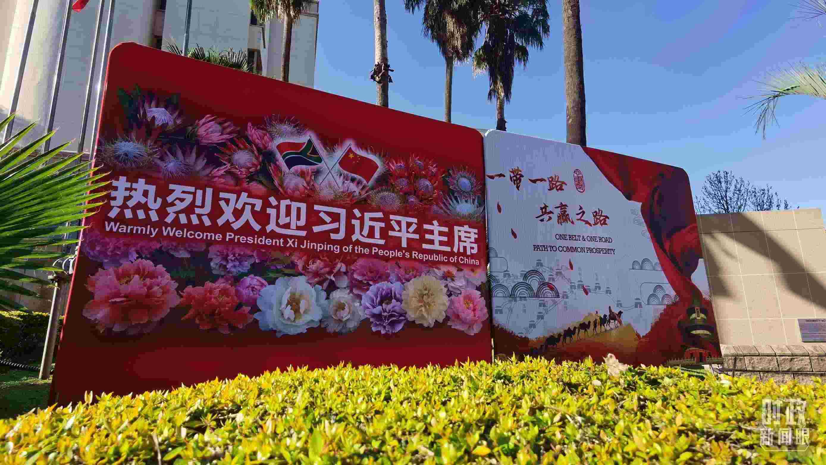△ 2023年8月,習(xí)近平主席抵達(dá)南非約翰內(nèi)斯堡,出席金磚國(guó)家領(lǐng)導(dǎo)人第十五次會(huì)晤并對(duì)南非進(jìn)行國(guó)事訪問(wèn)。圖為約翰內(nèi)斯堡街道邊“熱烈歡迎習(xí)近平主席”的標(biāo)語(yǔ)牌。(總臺(tái)央視記者曹亞星拍攝)