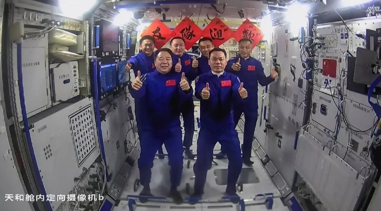 如今,中國空間站進(jìn)入應(yīng)用與發(fā)展階段。2023年12月31日晚,神舟十七號(hào)航天員湯洪波、唐勝杰、江新林在中國空間站收看習(xí)主席新年賀詞,三名航天員表示,要以自強(qiáng)不息的精神奮力攀登,把中國人的“太空家園”維護(hù)好、建設(shè)好。