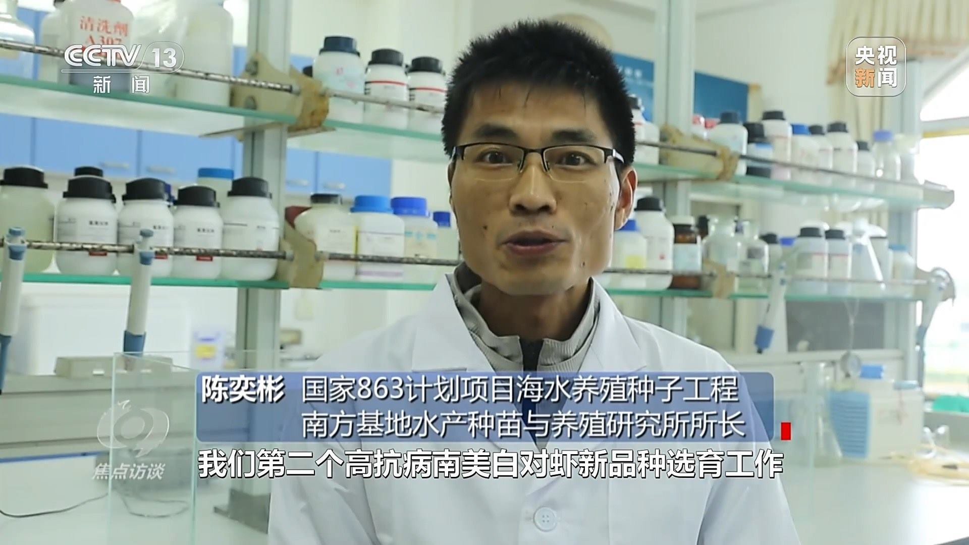 陳奕彬:“基地聯(lián)合中山大學,從多個區(qū)域引進多個種群,組成一個選育的基礎群體,又開始經(jīng)過一代群體選育,加上五代的家系選育,歷經(jīng)大概八代、十年的時間,終于在2011年的時候選出國內第一個抗病的南美白對蝦新品種:中興1號?!?/p>