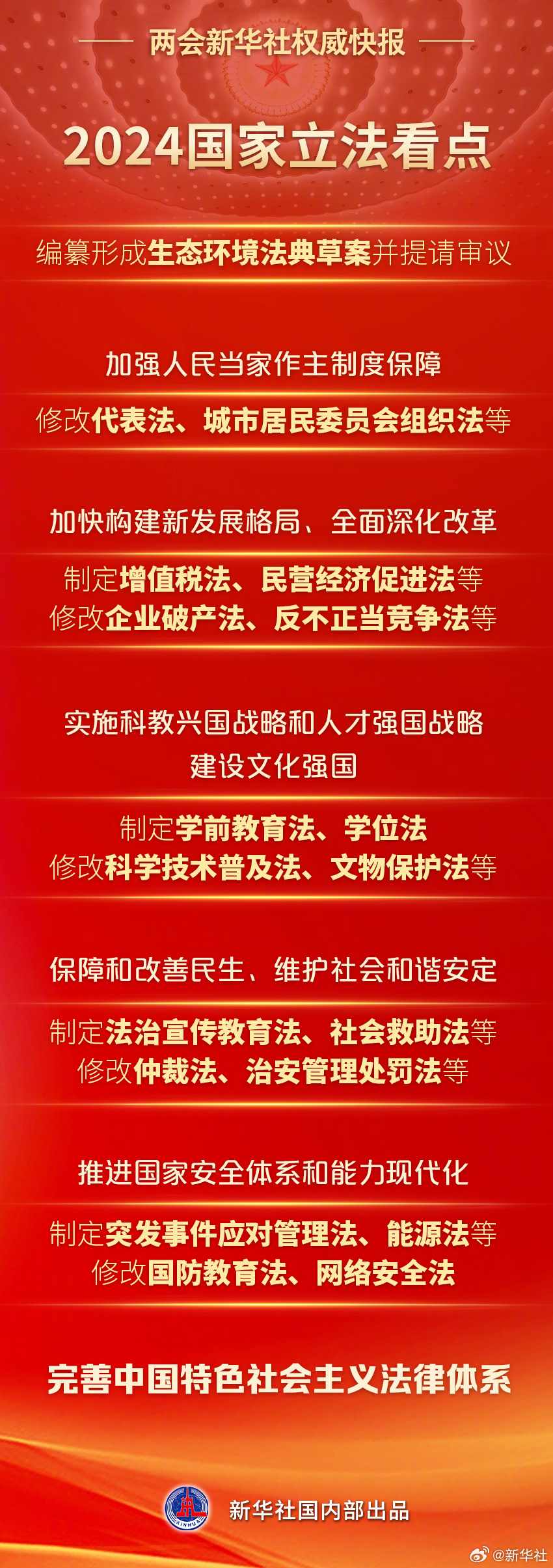 8日提請十四屆全國人大二次會議審議的全國人大常委會工作報告提出,2024年,要認(rèn)真落實常委會立法規(guī)劃,完善中國特色社會主義法律體系:制定民營經(jīng)濟促進法、學(xué)前教育法、社會救助法等,修改城市居民委員會組織法、文物保護法、網(wǎng)絡(luò)安全法等。