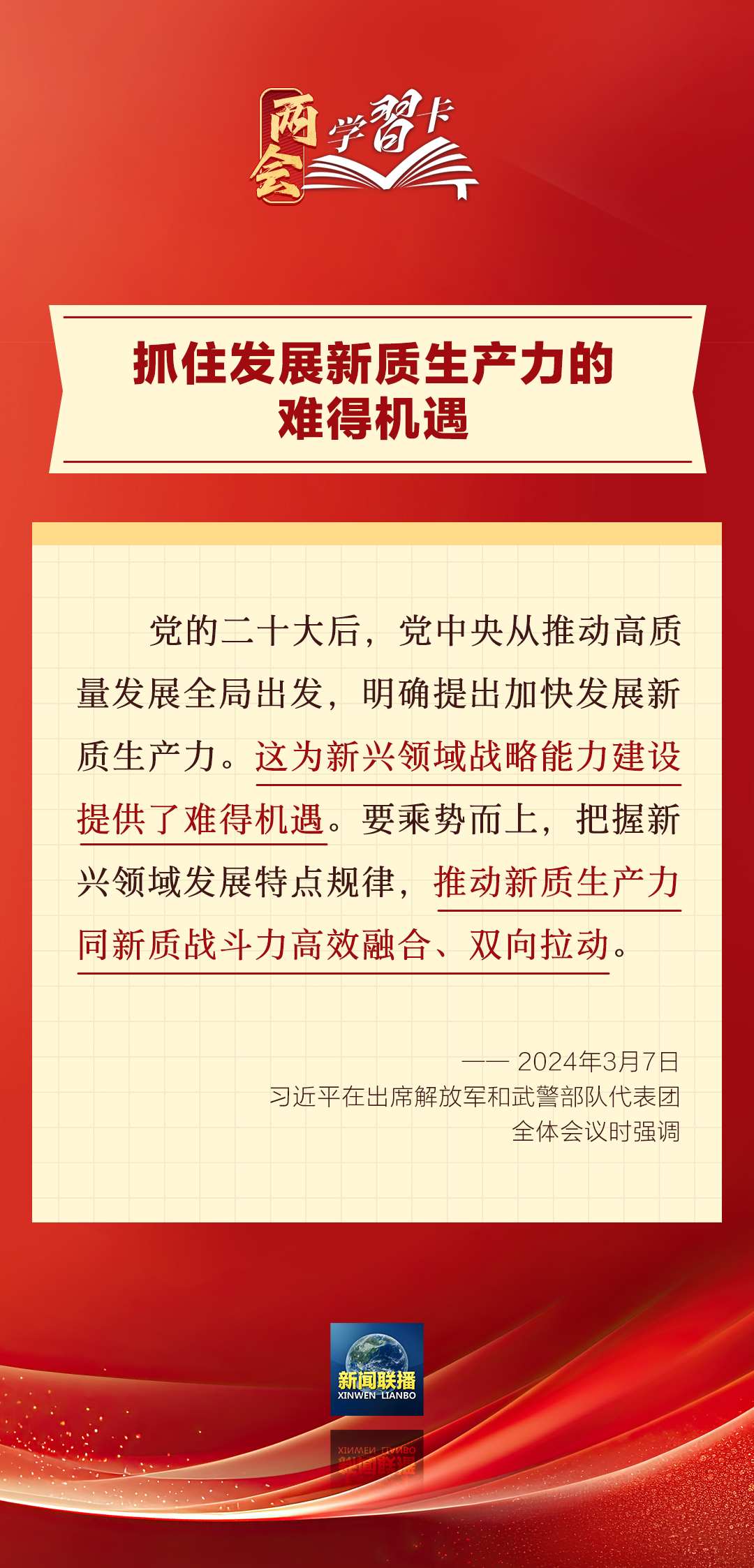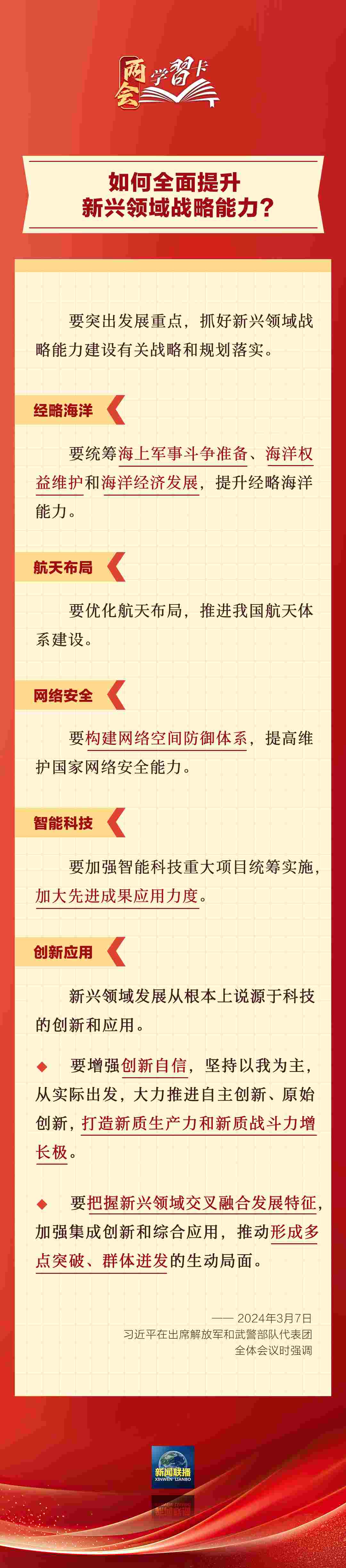 3月7日,習(xí)近平在出席解放軍和武警部隊(duì)代表團(tuán)全體會(huì)議時(shí)強(qiáng)調(diào),強(qiáng)化使命擔(dān)當(dāng),深化改革創(chuàng)新,全面提升新興領(lǐng)域戰(zhàn)略能力。如何提升新興領(lǐng)域戰(zhàn)略能力?一起學(xué)習(xí)↓↓↓