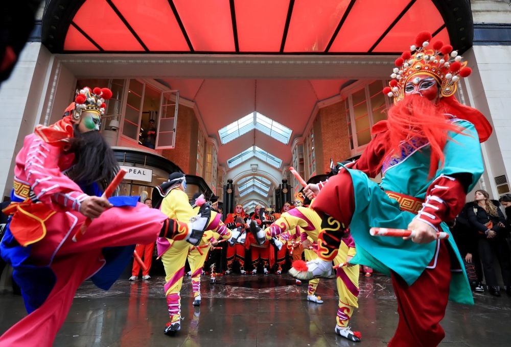 2024年2月10日,來自廣東普寧的英歌舞團(tuán)演員在英國(guó)倫敦伯靈頓拱廊街表演英歌舞。新華社記者 李穎 攝