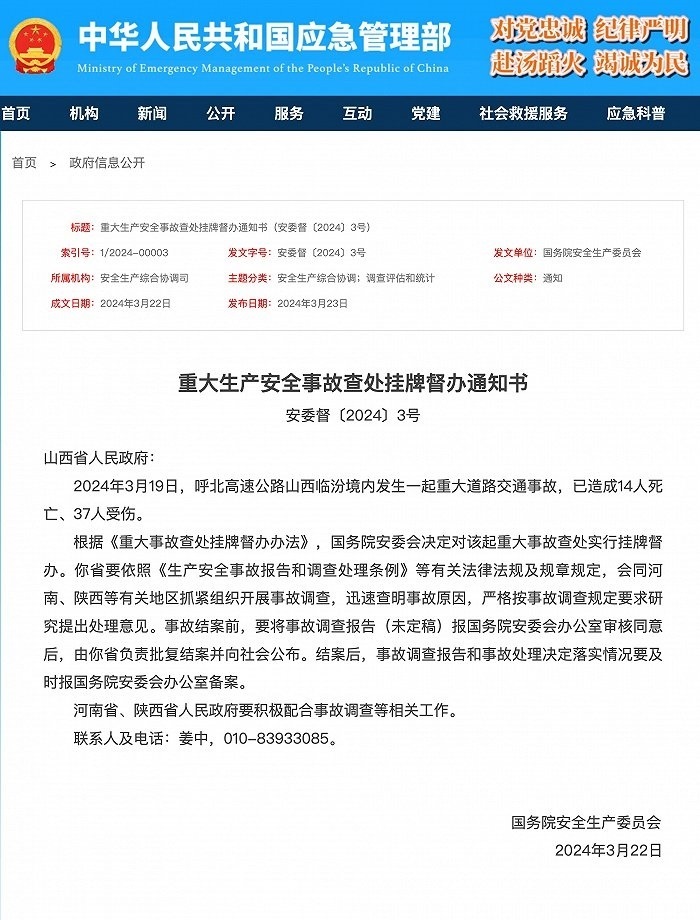 央視網(wǎng)消息:據(jù)應(yīng)急管理部網(wǎng)站消息,國務(wù)院安全生產(chǎn)委員會3月22日發(fā)布《重大生產(chǎn)安全事故查處掛牌督辦通知書》,2024年3月19日,呼北高速公路山西臨汾境內(nèi)發(fā)生一起重大道路交通事故,已造成14人死亡、37人受傷。根據(jù)《重大事故查處掛牌督辦辦法》,國務(wù)院安委會決定對該起重大事故查處實行掛牌督辦。