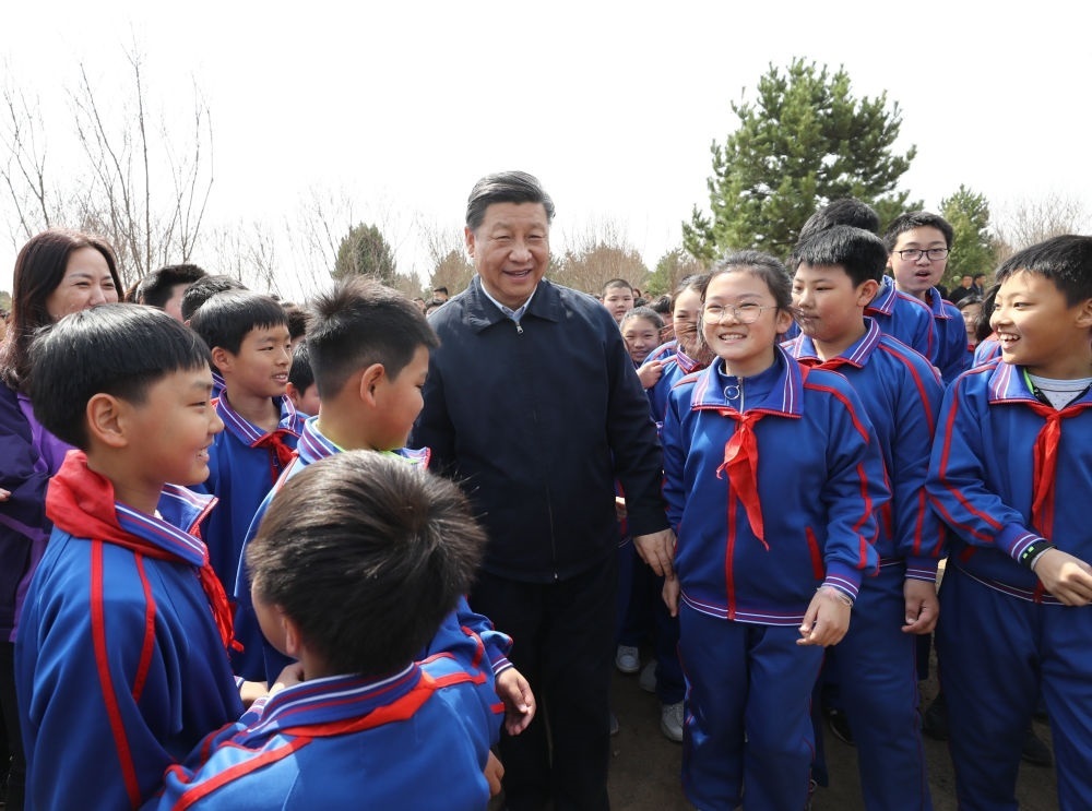 2019年4月8日,習(xí)近平等黨和國家領(lǐng)導(dǎo)人來到北京市通州區(qū)永順鎮(zhèn)參加首都義務(wù)植樹活動(dòng)。這是習(xí)近平同少先隊(duì)員在一起。