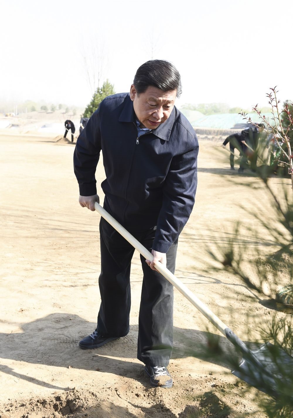 2014年4月4日,習(xí)近平等黨和國家領(lǐng)導(dǎo)人來到北京市海淀區(qū)南水北調(diào)團(tuán)城湖調(diào)節(jié)池參加首都義務(wù)植樹活動(dòng)。這是習(xí)近平在植樹。