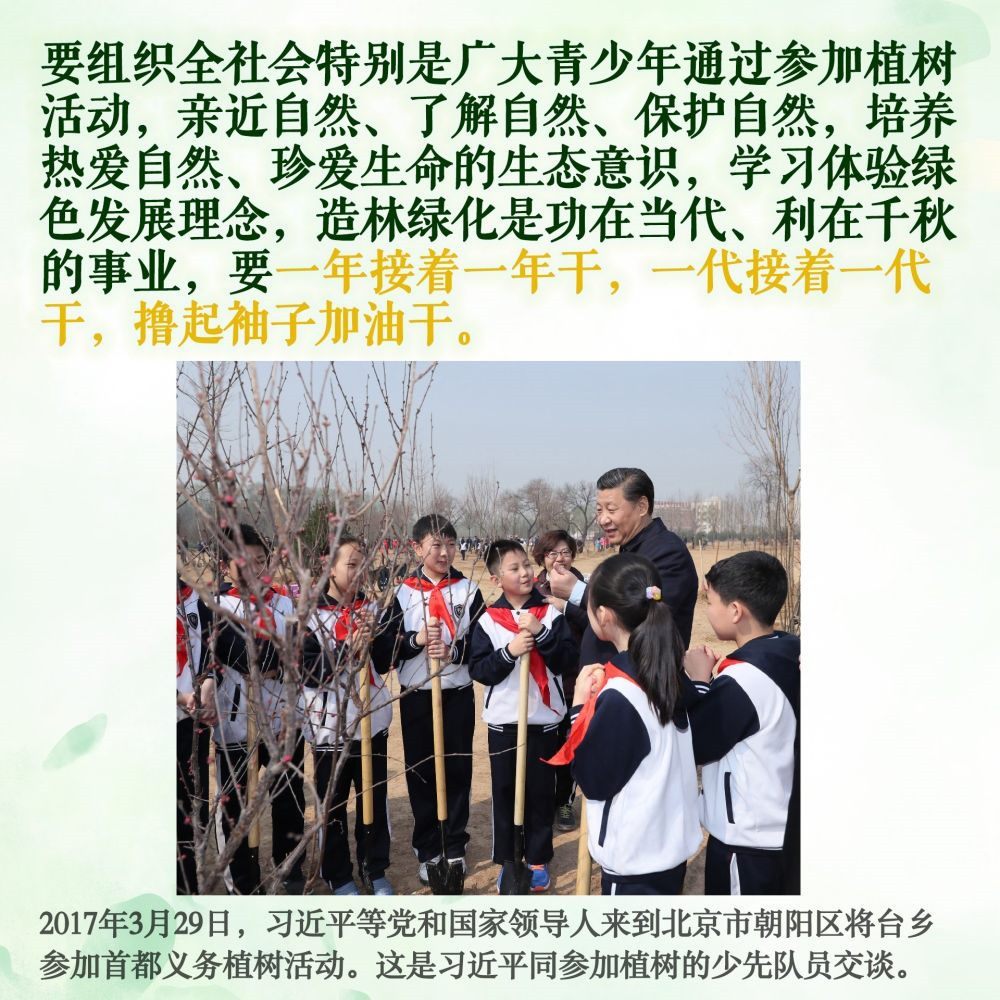 十年樹木,百年樹人。除去2020年因疫情防控考慮,每年植樹時(shí),習(xí)總書記都要和少年兒童一起,培土澆水、談心交流。好好學(xué)習(xí),鍛煉身體,熱愛勞動(dòng),愛護(hù)環(huán)境,德智體美勞全面發(fā)展,長大后成為建設(shè)祖國的棟梁之才……習(xí)爺爺?shù)囊笠髧谕泻拖<?,激?lì)著新時(shí)代少年兒童奮發(fā)有為、向陽成長。