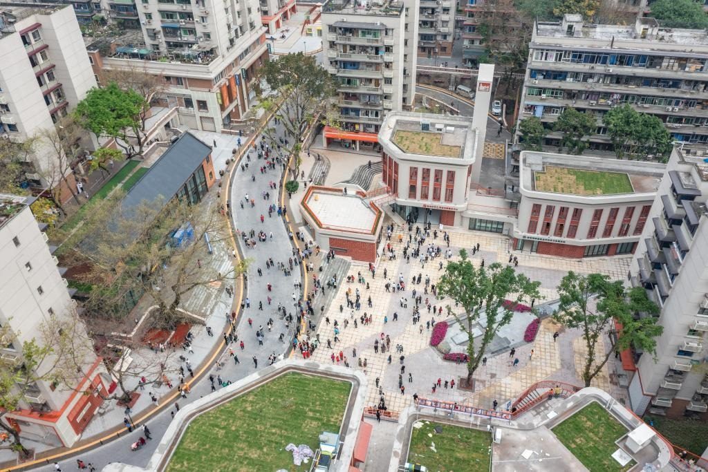 2023年4月28日,在竣工亮相的民主村片區(qū)城市更新項(xiàng)目(一期),人們?cè)谝惶幑部臻g休息(無人機(jī)照片)。