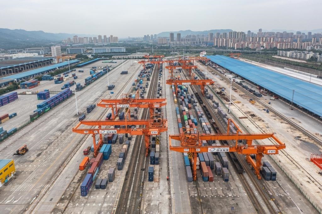 如今,“四向”物流通道在這里交匯:向西,中歐班列直達(dá)歐洲多國;向東,渝甬班列直抵寧波舟山港;向北,“渝滿俄”班列開行;向南,西部陸海新通道直達(dá)廣西欽州港,再通往世界多個國家和地區(qū)……