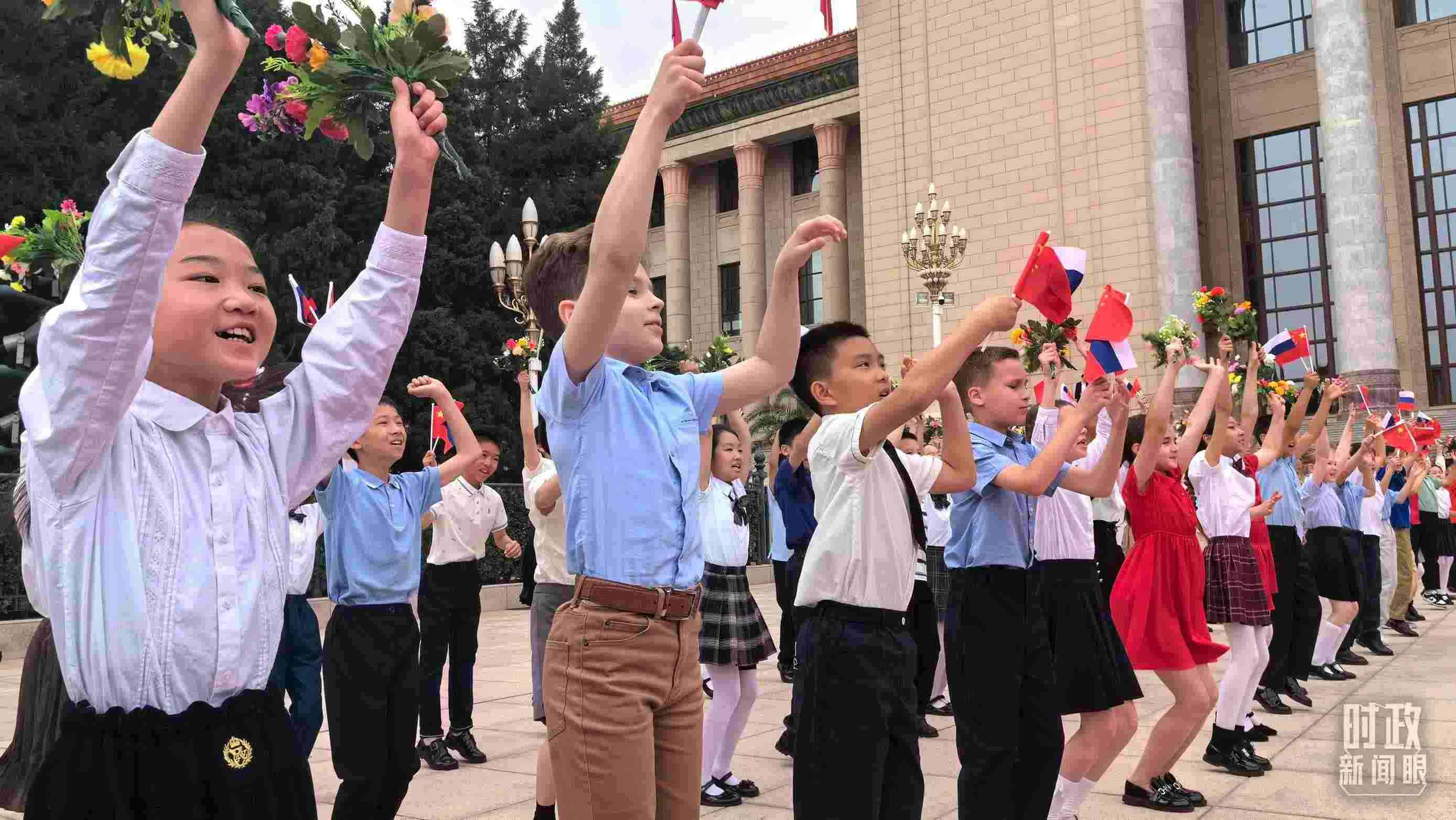 現(xiàn)場有兩個特殊的安排。一個是軍樂團的演奏曲目。軍樂團選取了《莫斯科郊外的晚上》作為迎賓曲。另一個是少年兒童歡迎群體。儀式現(xiàn)場除了中國小朋友,在華的俄羅斯小朋友也來參加活動。這些周到細致的安排,傳遞的是世代友好的情誼。