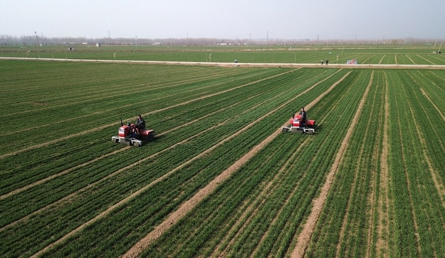 山東省汶上縣,農(nóng)民駕駛農(nóng)機(jī)在高標(biāo)準(zhǔn)農(nóng)田里進(jìn)行小麥春季管護(hù)作業(yè)(2024年3月13日攝,無人機(jī)照片)。新華社記者 徐速繪 攝