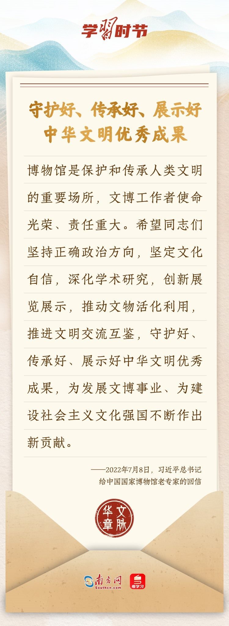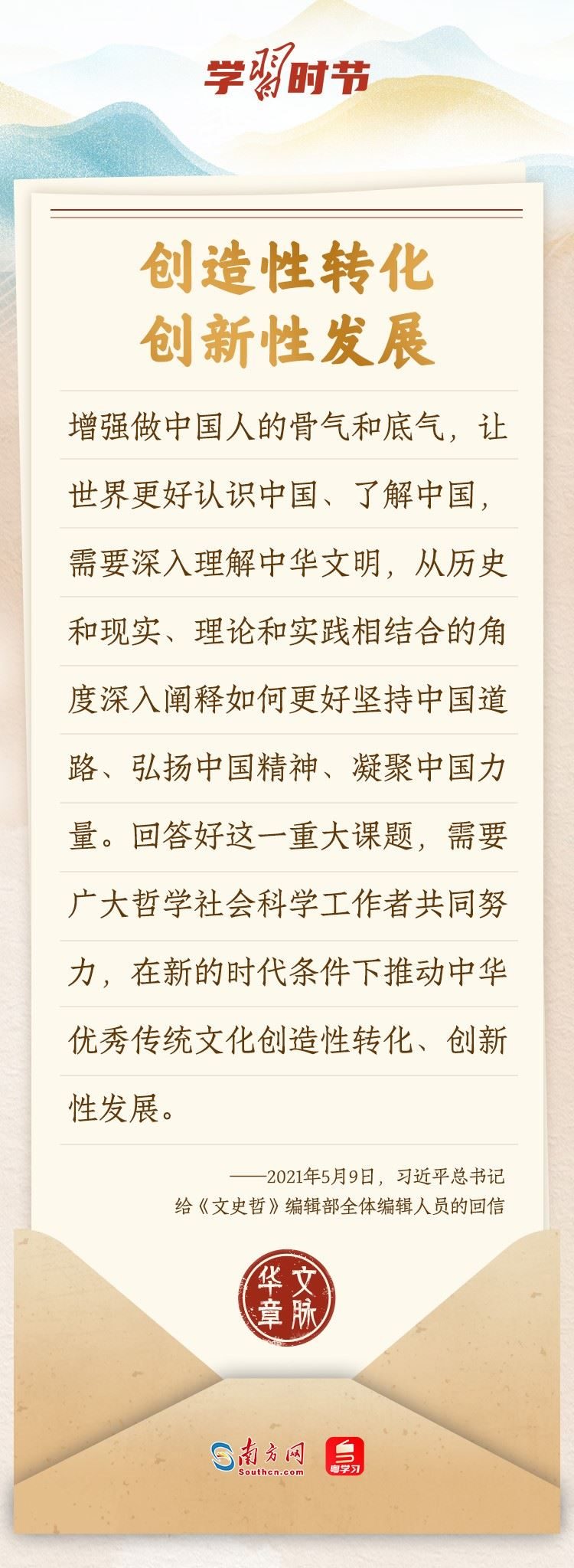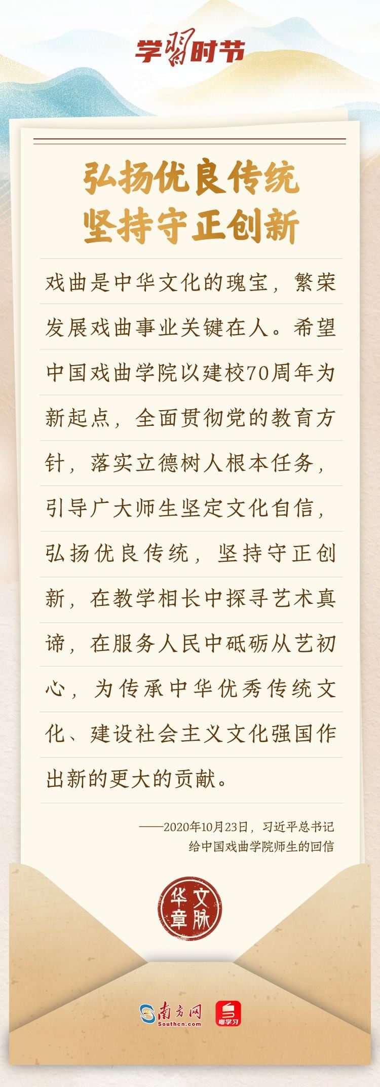 “中華民族在幾千年歷史中創(chuàng)造和延續(xù)的中華優(yōu)秀傳統(tǒng)文化,是中華民族的根和魂?!绷?xí)近平總書記多次通過發(fā)賀信、寫回信等方式,表達(dá)著對(duì)弘揚(yáng)中華優(yōu)秀傳統(tǒng)文化的殷切希望,飽含深情、字字暖心、催人奮進(jìn)。讓我們一起“讀”信。