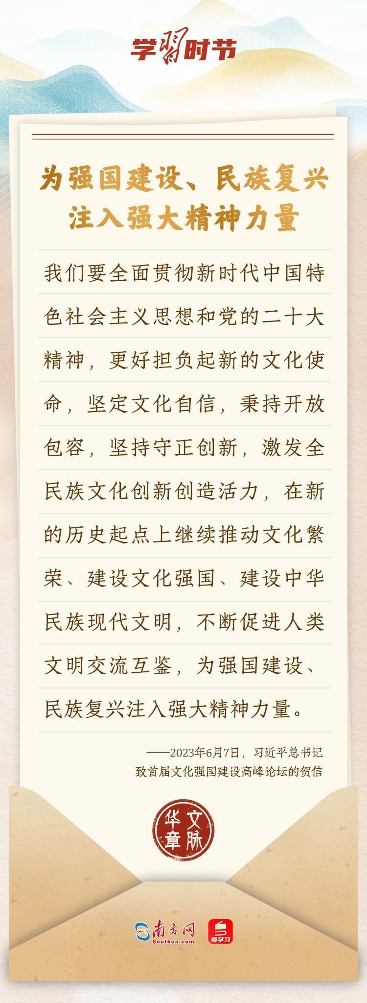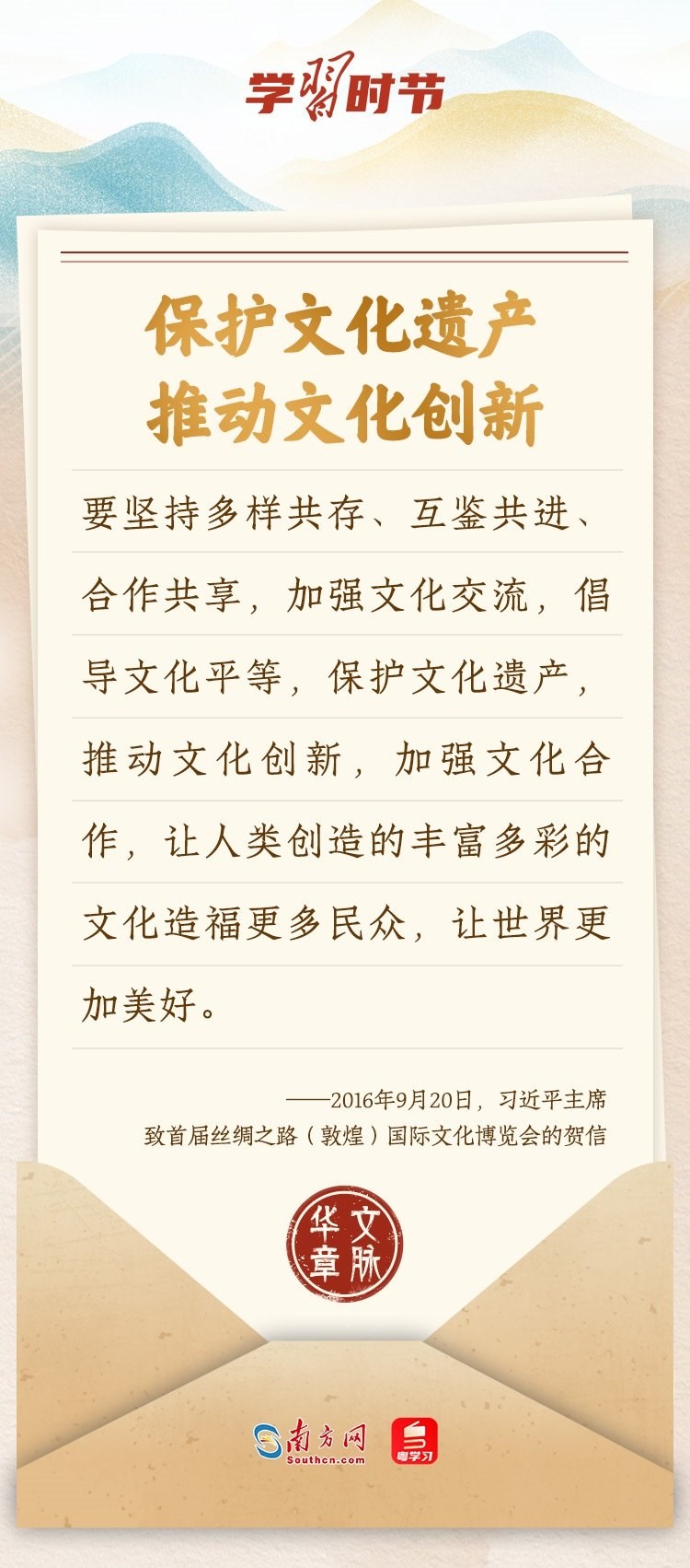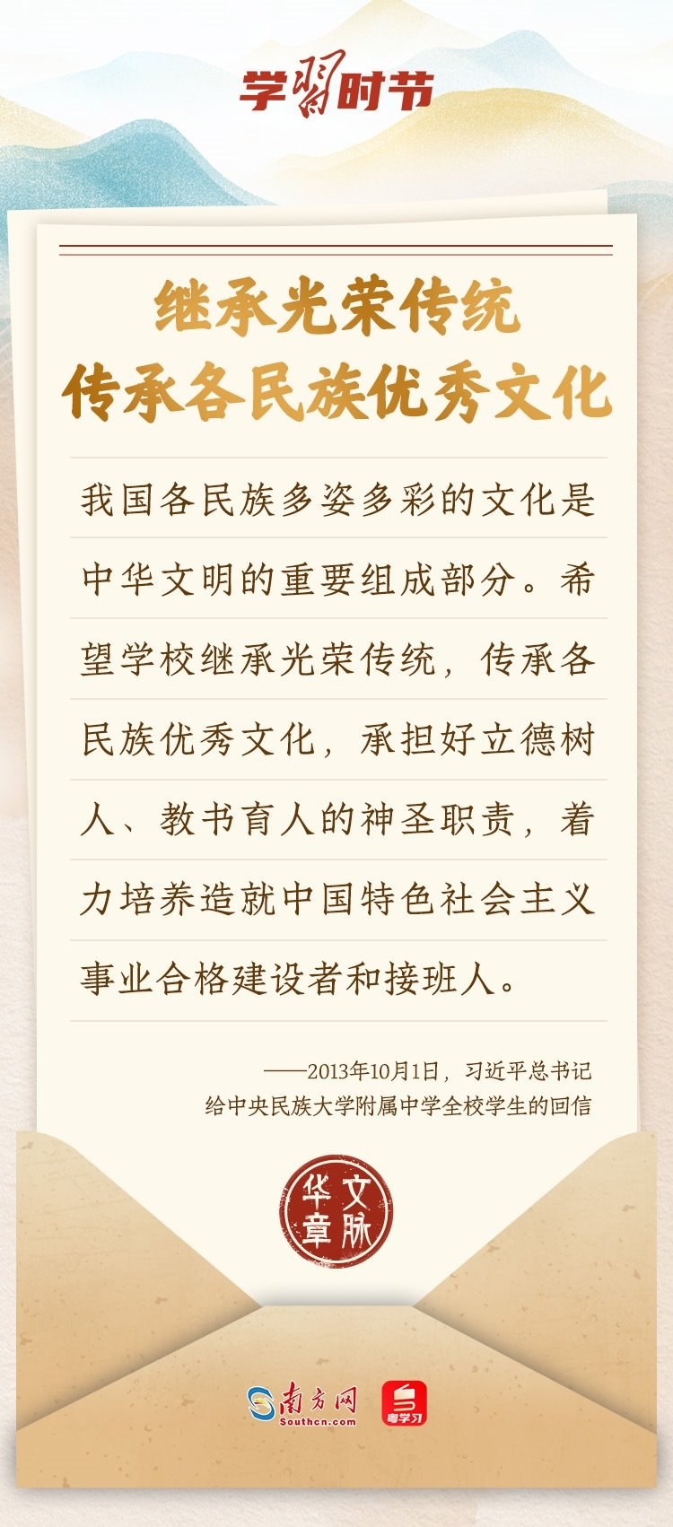 “中華民族在幾千年歷史中創(chuàng)造和延續(xù)的中華優(yōu)秀傳統(tǒng)文化,是中華民族的根和魂?!绷?xí)近平總書記多次通過發(fā)賀信、寫回信等方式,表達(dá)著對(duì)弘揚(yáng)中華優(yōu)秀傳統(tǒng)文化的殷切希望,飽含深情、字字暖心、催人奮進(jìn)。讓我們一起“讀”信。