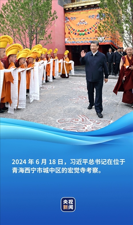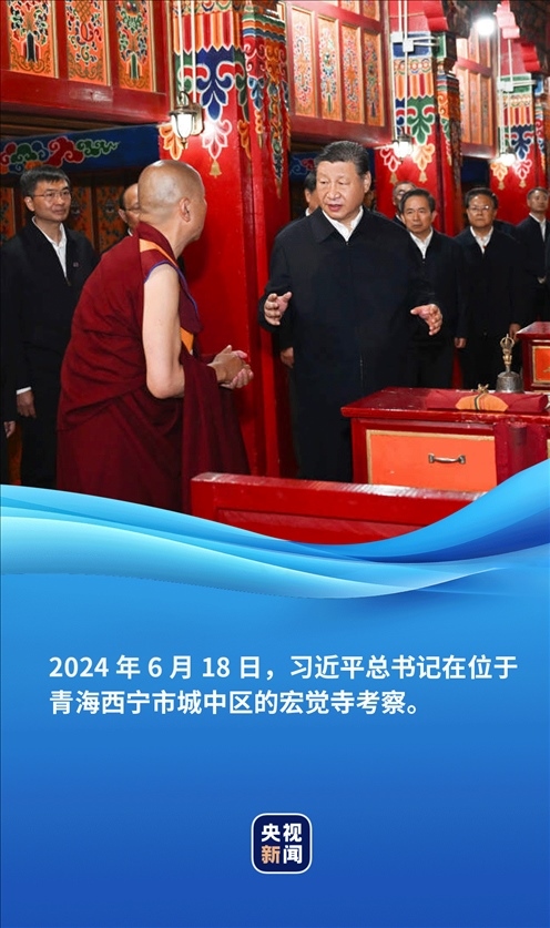 6月18日,正在青??疾斓牧?xí)近平總書記來到位于西寧市城中區(qū)的宏覺寺。在寺前院落,宏覺寺民主管理委員會負(fù)責(zé)人向總書記敬獻哈達(dá),僧人提香爐、持寶傘迎接總書記。