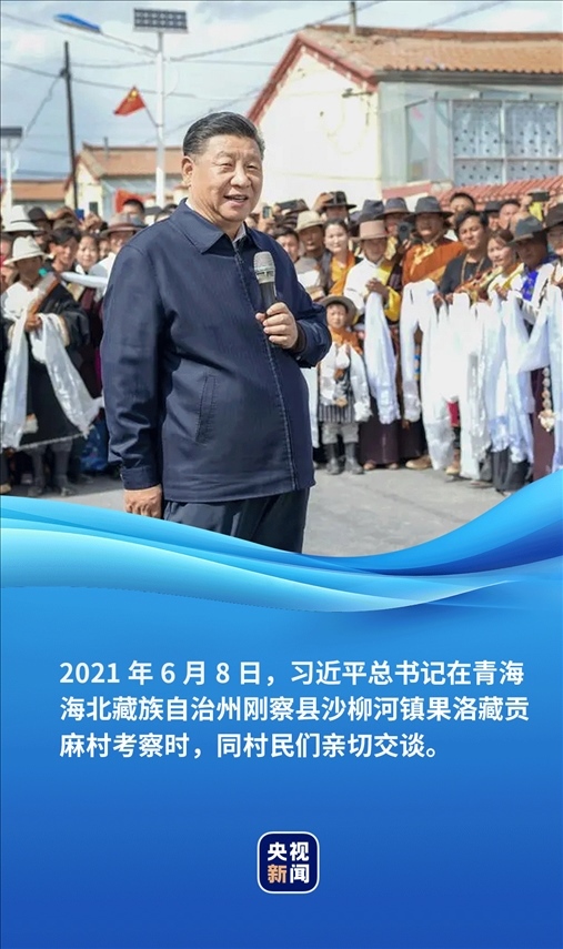 藍(lán)天白云下,一排排紅瓦黃墻的平房小院錯落有致,筆直整潔的村道兩旁立著太陽能路燈。村民索南才讓帶著一家三代站在家門口,向總書記獻上潔白的哈達(dá)。