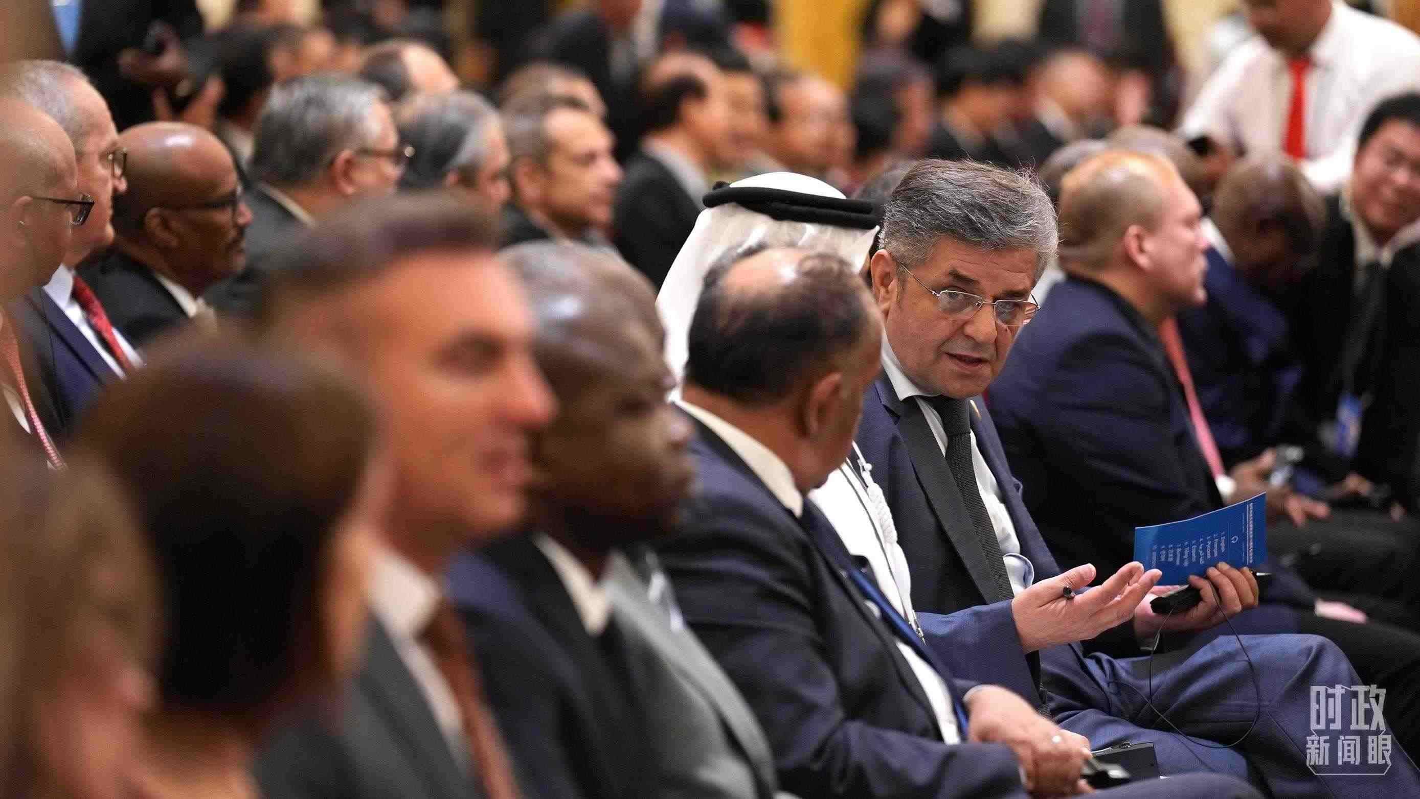 △2023年10月,第三屆“一帶一路”國際合作高峰論壇參會人員駐足了解“一帶一路”標志性項目。(總臺國廣記者李晉拍攝)