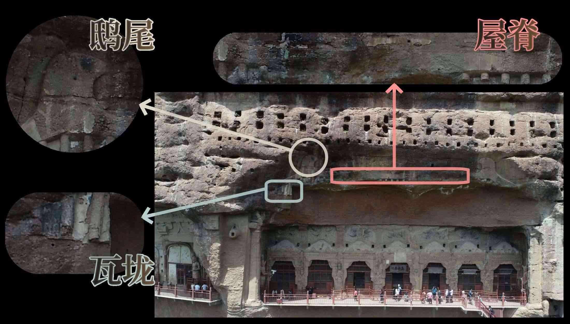 在山巖上鑿出屋脊、鴟尾、瓦垅等