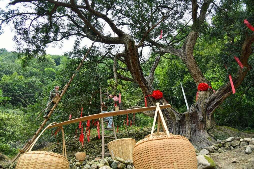 柯橋區(qū)稽東鎮(zhèn)古香榧樹在保護(hù)中煥發(fā)生機(jī),成為當(dāng)?shù)乩习傩盏摹爸赂粯洹?。(柯橋區(qū)委宣傳部供圖)