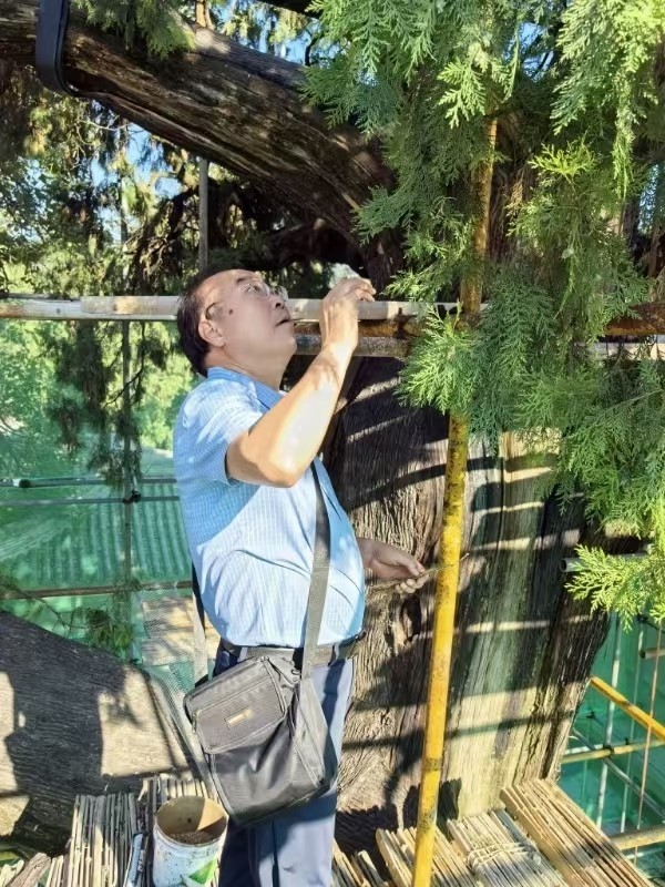 2024年6月,康永祥教授在觀察保生柏新枝萌發(fā)情況。(受訪者供圖)