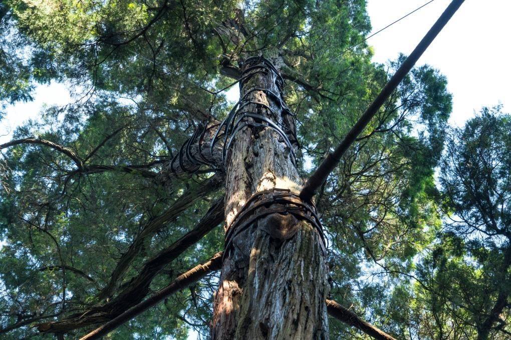 2024年8月12日在劍閣縣翠云廊拍攝的古樹“馬甲”,在樹干中部安裝碳纖維加固“馬甲”,與周邊樹木通過硬支護(hù)進(jìn)行彈性連接,可以有效保障樹體安全穩(wěn)固。新華社記者 唐文豪 攝